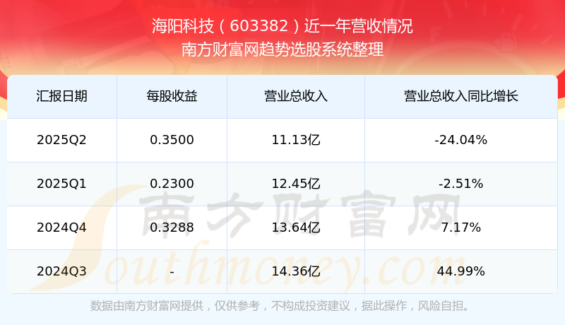 海陽科技披露了2025年第二季度財報。報告顯示,海陽科技2025年第二季度實現(xiàn)營收11.13億元,同比-24.04%;歸母凈利潤4728.81萬元,同比-12.27%。