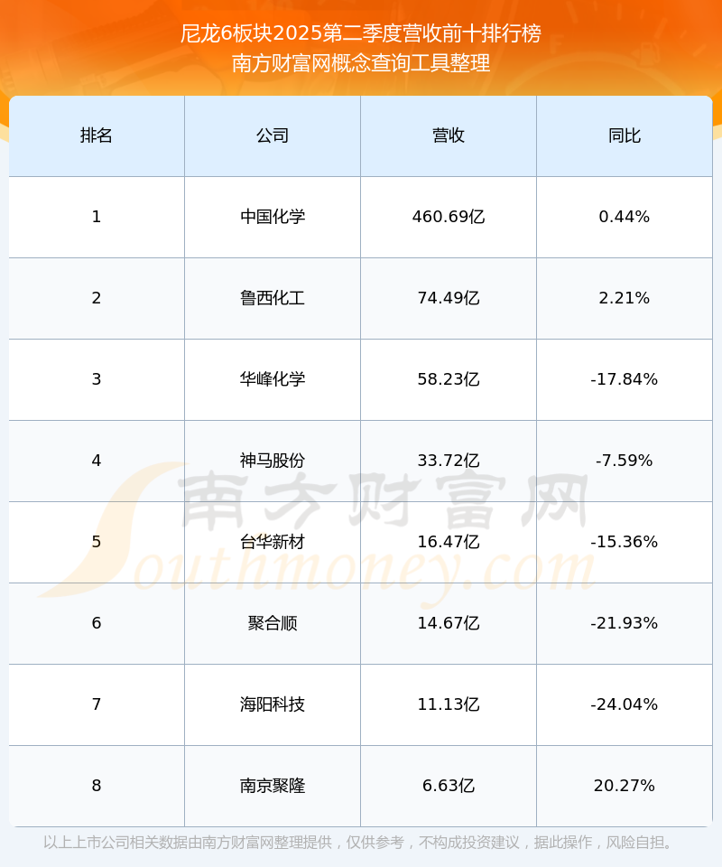按照南方財富網概念查詢工具統(tǒng)計,該股所屬板塊為尼龍6板塊,該板塊共有8只股票,海陽科技2025第二季度營收在該板塊中排名為第7名,該板塊2025第二季度營收排名前十的股票如下表: