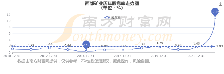 近年西部礦業(yè)年度股息率走勢如下圖:
