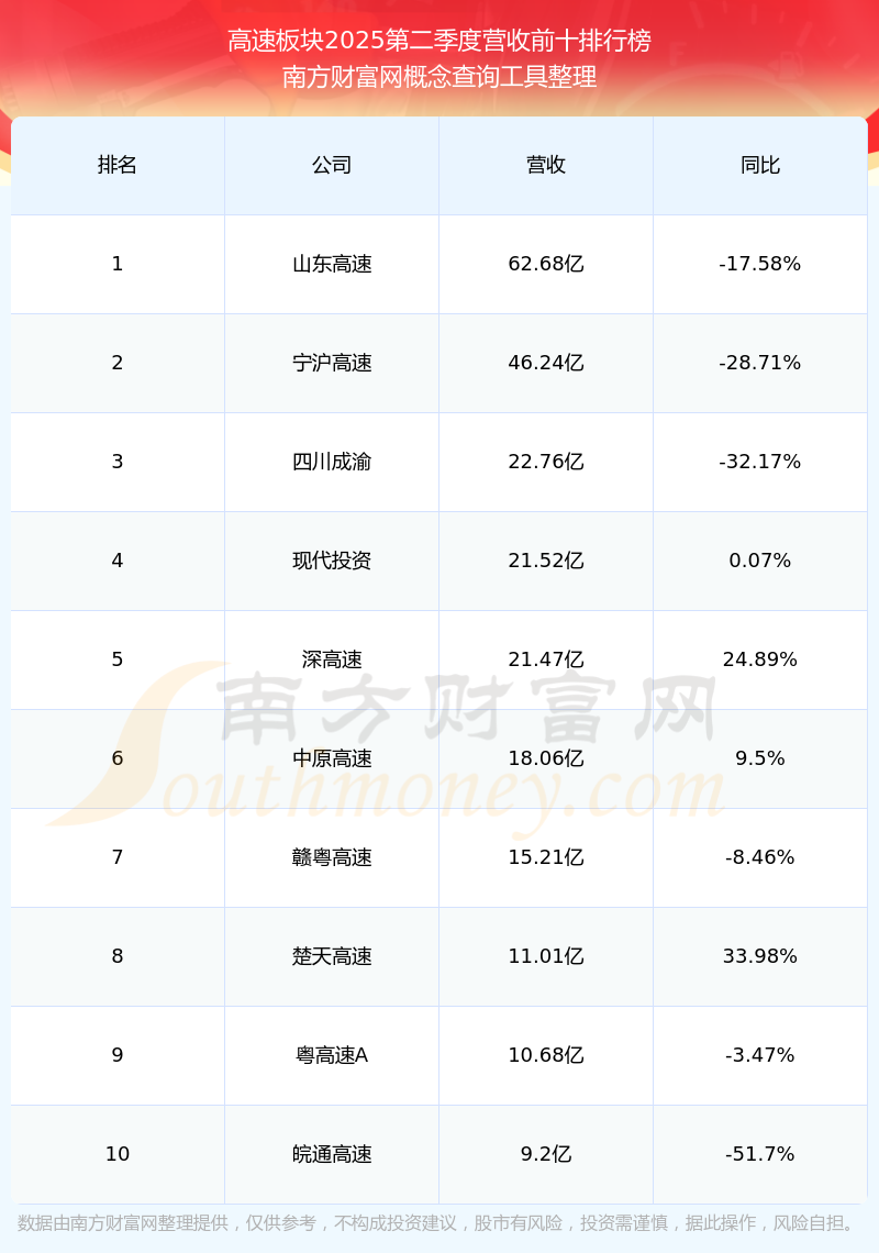 按照南方財富網(wǎng)概念查詢工具統(tǒng)計,該股所屬板塊為高速板塊,該板塊共有15只股票,寧滬高速2025第二季度營收在該板塊中排名為第2名,該板塊2025第二季度營收排名前十的股票如下表: