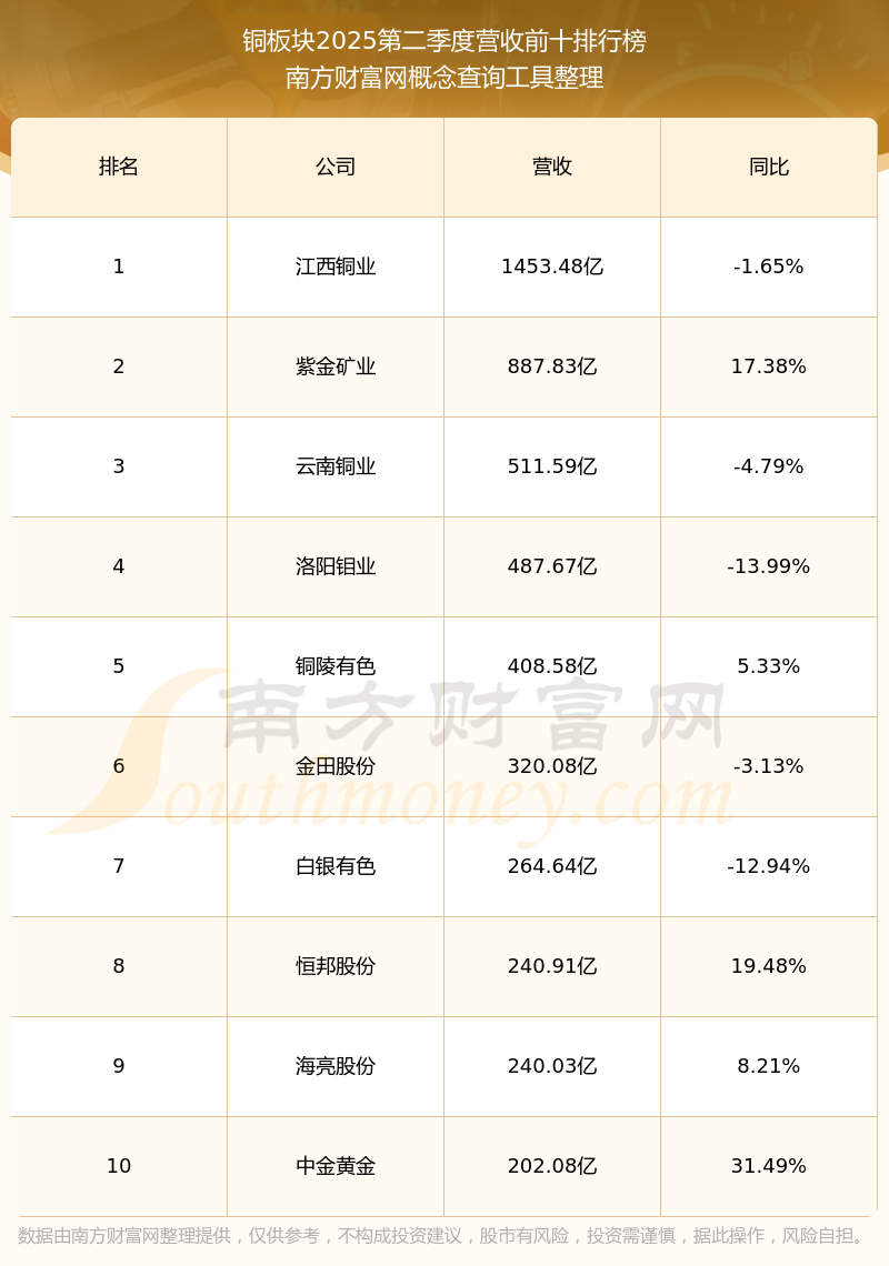 按照南方財(cái)富網(wǎng)概念查詢工具統(tǒng)計(jì),該股所屬板塊為銅板塊,該板塊共有33只股票,中金黃金2025第二季度營(yíng)收在該板塊中排名為第10名,該板塊2025第二季度營(yíng)收排名前十的股票如下表: