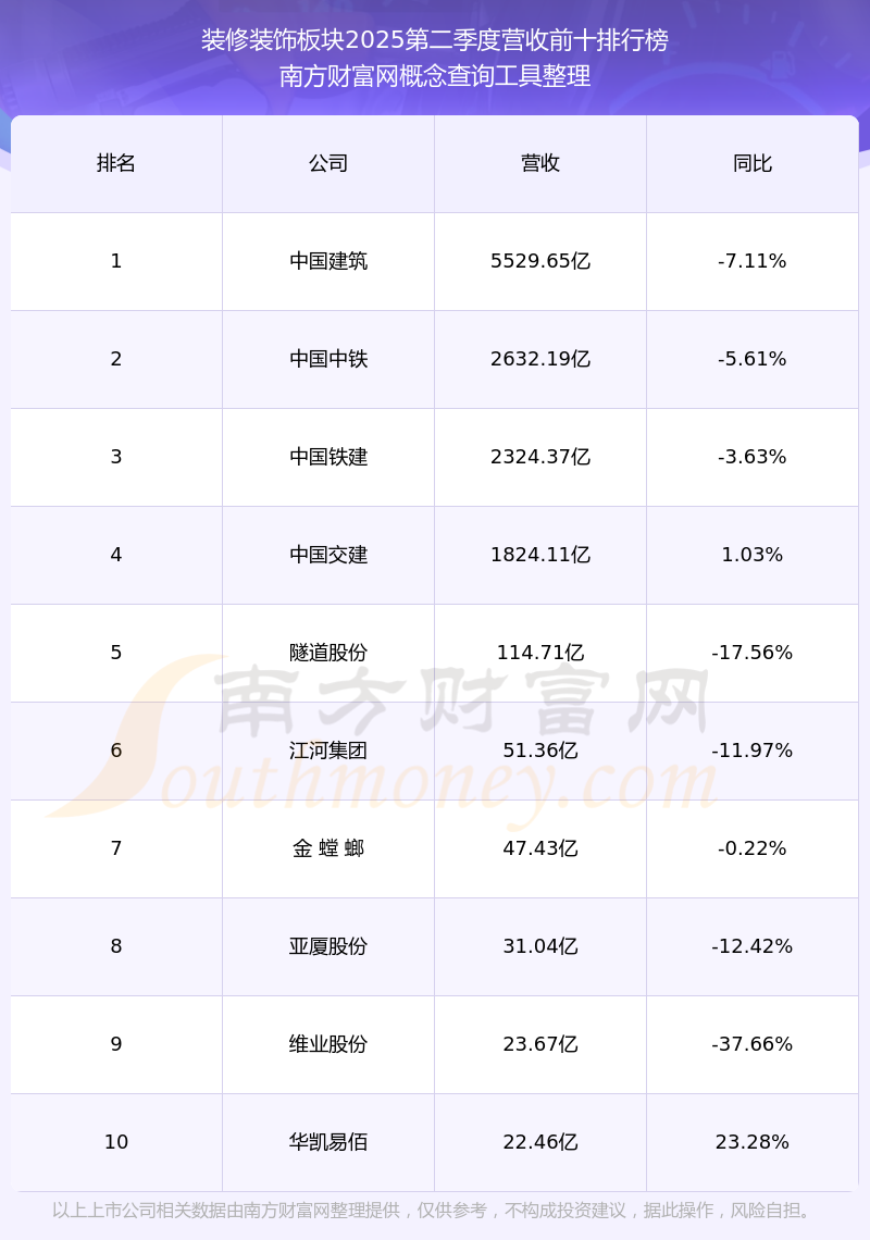 按照南方財(cái)富網(wǎng)概念查詢工具統(tǒng)計(jì),該股所屬板塊為裝修裝飾板塊,該板塊共有59只股票,江河集團(tuán)2025第二季度營收在該板塊中排名為第6名,該板塊2025第二季度營收排名前十的股票如下表: