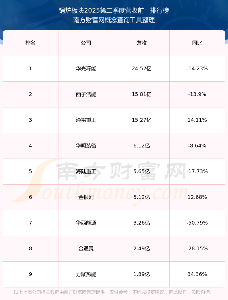 按照南方財(cái)富網(wǎng)概念查詢工具統(tǒng)計(jì),該股所屬板塊為鍋爐板塊,該板塊共有9只股票,力聚熱能2025第二季度營收在該板塊中排名為第9名,該板塊2025第二季度營收排名前十的股票如下表: