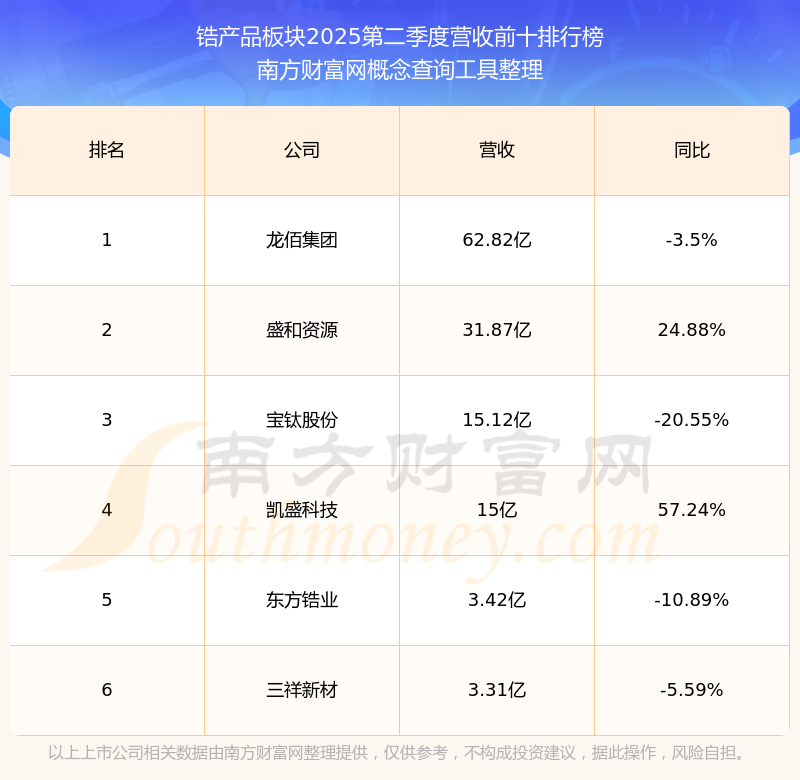 按照南方財富網(wǎng)概念查詢工具統(tǒng)計,該股所屬板塊為鋯產(chǎn)品板塊,該板塊共有6只股票,三祥新材2025第二季度營收在該板塊中排名為第6名,該板塊2025第二季度營收排名前十的股票如下表: