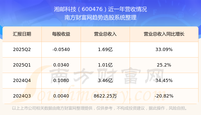 湘郵科技(600476)發(fā)布2025年第二季度財報。2025年第二季度湘郵科技實現(xiàn)營業(yè)收入1.69億元,同比增加33.09元%,環(huán)比增加67.82%;凈利潤為-882.72萬元,同比增長-26.94%,環(huán)比增長-258.95%。