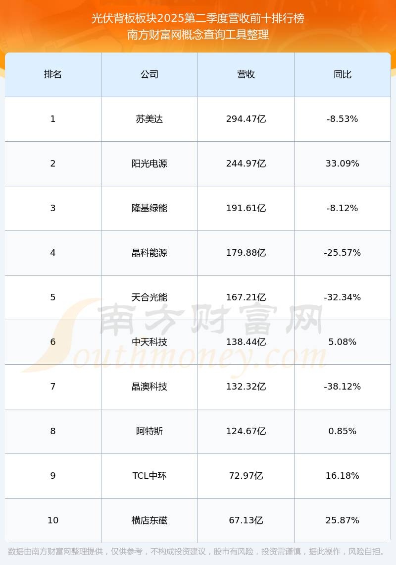 按照南方財(cái)富網(wǎng)概念查詢工具統(tǒng)計(jì),該股所屬板塊為光伏背板板塊,該板塊共有32只股票,賽伍技術(shù)2025第二季度營(yíng)收在該板塊中排名為第26名,該板塊2025第二季度營(yíng)收排名前十的股票如下表: