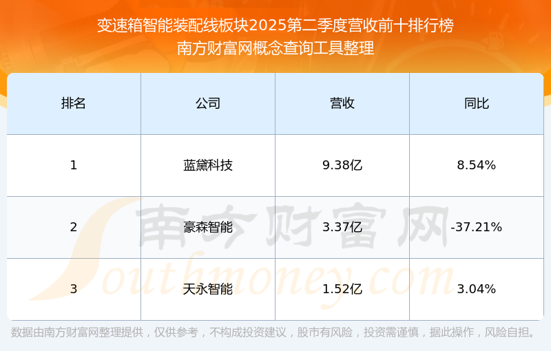按照南方財富網(wǎng)概念查詢工具統(tǒng)計,該股所屬板塊為變速箱智能裝配線板塊,該板塊共有3只股票,豪森智能2025第二季度營收在該板塊中排名為第2名,該板塊2025第二季度營收排名前十的股票如下表: