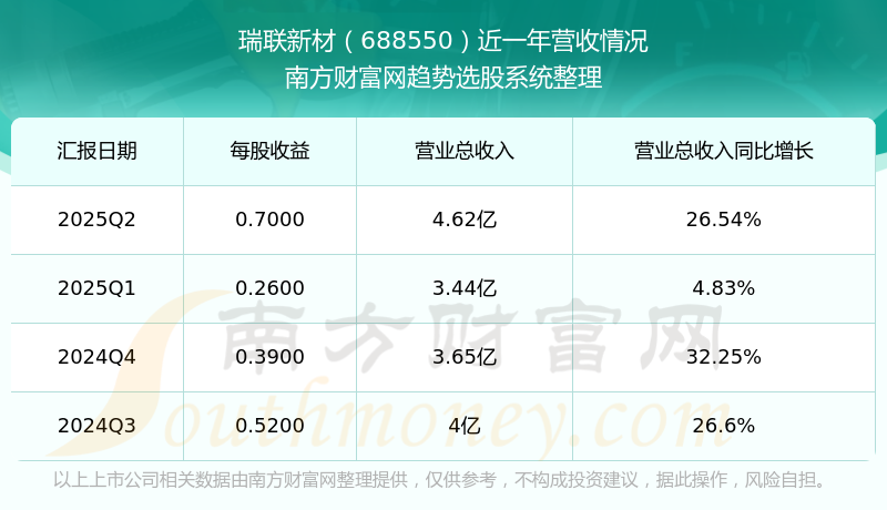 瑞聯(lián)新材2025年第二季度顯示,公司主營收入4.62億元,同比26.54%;歸母凈利潤1.2億元,同比97.48%;扣非凈利潤1.21億元,同比117.51%。