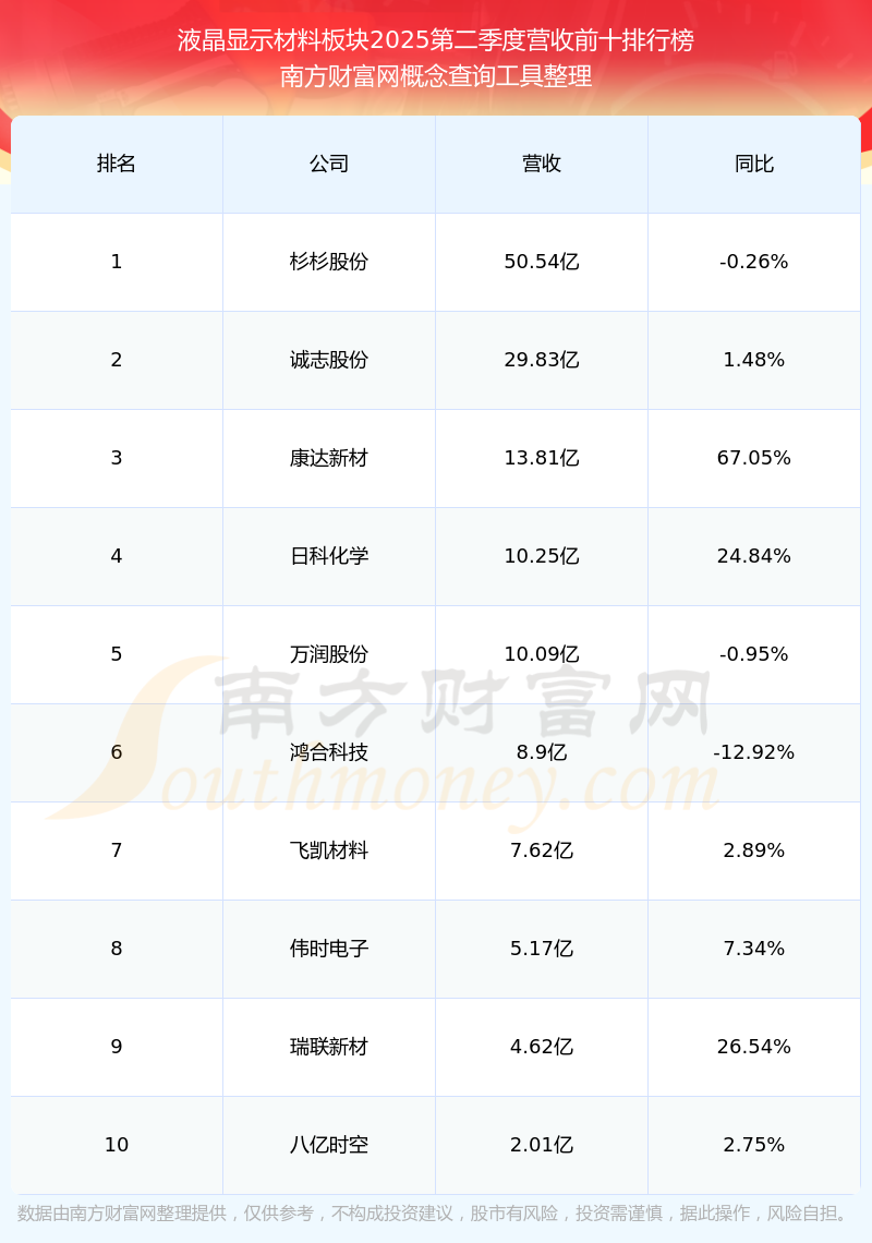 按照南方財(cái)富網(wǎng)概念查詢工具統(tǒng)計(jì),該股所屬板塊為液晶顯示材料板塊,該板塊共有12只股票,瑞聯(lián)新材2025第二季度營收在該板塊中排名為第9名,該板塊2025第二季度營收排名前十的股票如下表: