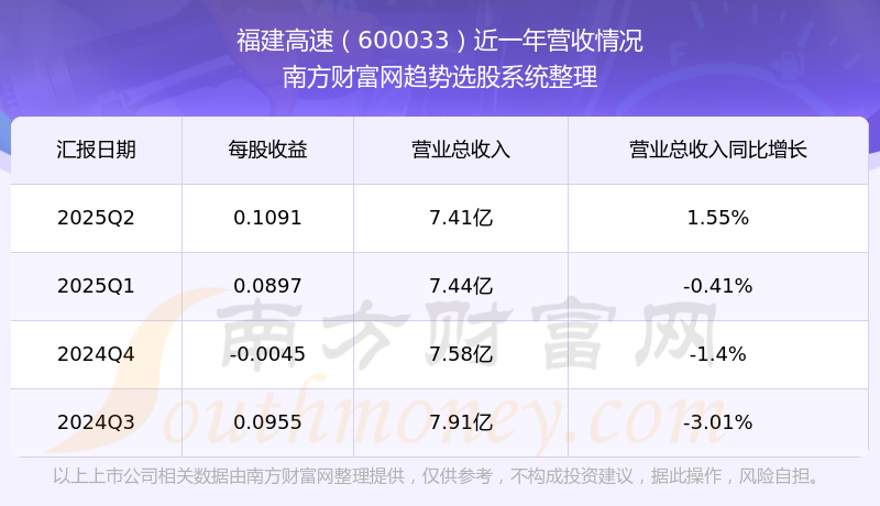 福建高速(600033)披露2025年第二季度報告,報告期實現(xiàn)營收7.41億元,同比1.55%;歸母凈利潤2.99億元,同比4.26%;扣非凈利潤3.01億元,同比7.08%。