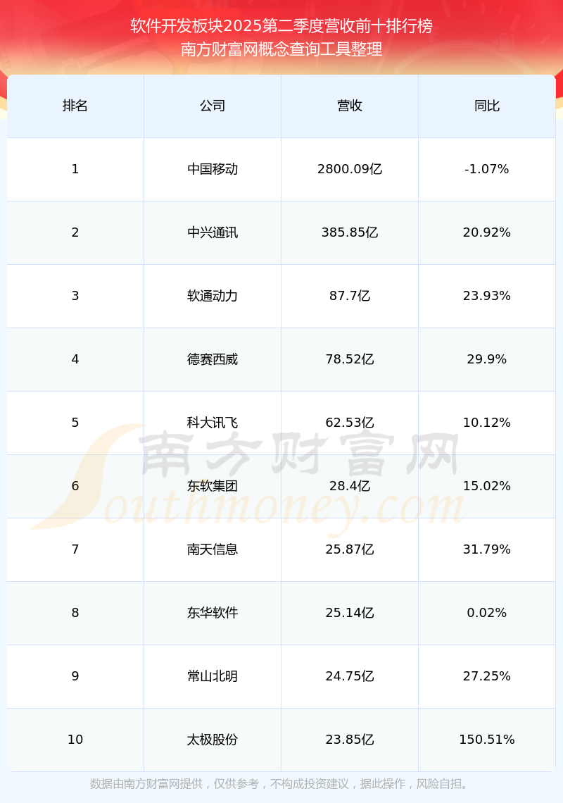 按照南方財(cái)富網(wǎng)概念查詢工具統(tǒng)計(jì),該股所屬板塊為軟件開發(fā)板塊,該板塊共有216只股票,健麾信息2025第二季度營(yíng)收在該板塊中排名為第216名,該板塊2025第二季度營(yíng)收排名前十的股票如下表: