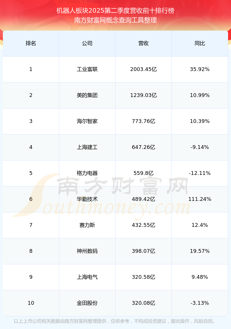 按照南方財(cái)富網(wǎng)概念查詢工具統(tǒng)計(jì),該股所屬板塊為機(jī)器人板塊,該板塊共有781只股票,凱爾達(dá)2025第二季度營(yíng)收在該板塊中排名為第646名,該板塊2025第二季度營(yíng)收排名前十的股票如下表: