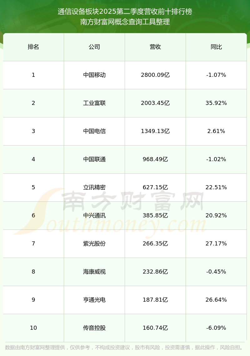 按照南方財(cái)富網(wǎng)概念查詢工具統(tǒng)計(jì),該股所屬板塊為通信設(shè)備板塊,該板塊共有167只股票,長(zhǎng)江通信2025第二季度營(yíng)收在該板塊中排名為第102名,該板塊2025第二季度營(yíng)收排名前十的股票如下表: