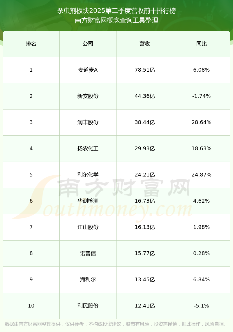 按照南方財(cái)富網(wǎng)概念查詢工具統(tǒng)計(jì),該股所屬板塊為殺蟲(chóng)劑板塊,該板塊共有25只股票,美邦股份2025第二季度營(yíng)收在該板塊中排名為第24名,該板塊2025第二季度營(yíng)收排名前十的股票如下表: