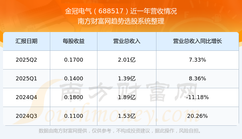 金冠電氣2025年第二季度顯示,公司主營收入2.01億元,同比7.33%;歸母凈利潤2324.38萬元,同比-23.89%;扣非凈利潤2125.29萬元,同比-21.8%。