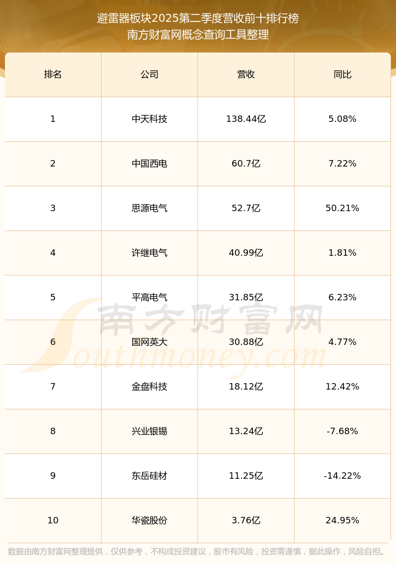 按照南方財(cái)富網(wǎng)概念查詢工具統(tǒng)計(jì),該股所屬板塊為避雷器板塊,該板塊共有18只股票,金冠電氣2025第二季度營收在該板塊中排名為第14名,該板塊2025第二季度營收排名前十的股票如下表: