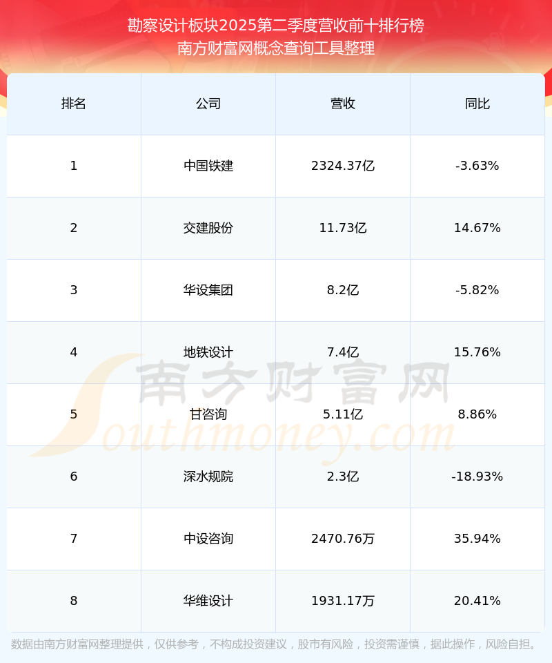 按照南方財富網(wǎng)概念查詢工具統(tǒng)計,該股所屬板塊為勘察設計板塊,該板塊共有8只股票,華設集團2025第二季度營收在該板塊中排名為第3名,該板塊2025第二季度營收排名前十的股票如下表: