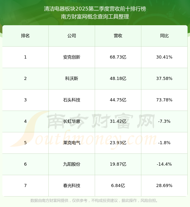 按照南方財富網(wǎng)概念查詢工具統(tǒng)計,該股所屬板塊為清潔電器板塊,該板塊共有7只股票,春光科技2025第二季度營收在該板塊中排名為第7名,該板塊2025第二季度營收排名前十的股票如下表:
