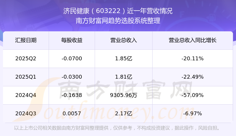 濟民健康2025年第二季度財報顯示,公司主營收入1.85億元,同比-20.11%;歸母凈利潤-3905.94萬元,同比-469.25%;扣非凈利潤-3965.19萬元,同比-470.9%;
