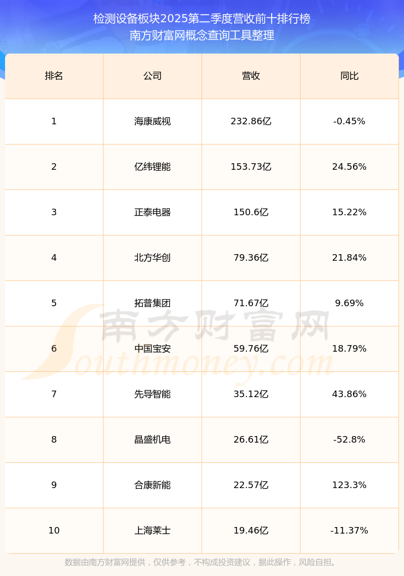 按照南方財富網(wǎng)概念查詢工具統(tǒng)計,該股所屬板塊為檢測設(shè)備板塊,該板塊共有48只股票,華興源創(chuàng)2025第二季度營收在該板塊中排名為第19名,該板塊2025第二季度營收排名前十的股票如下表: