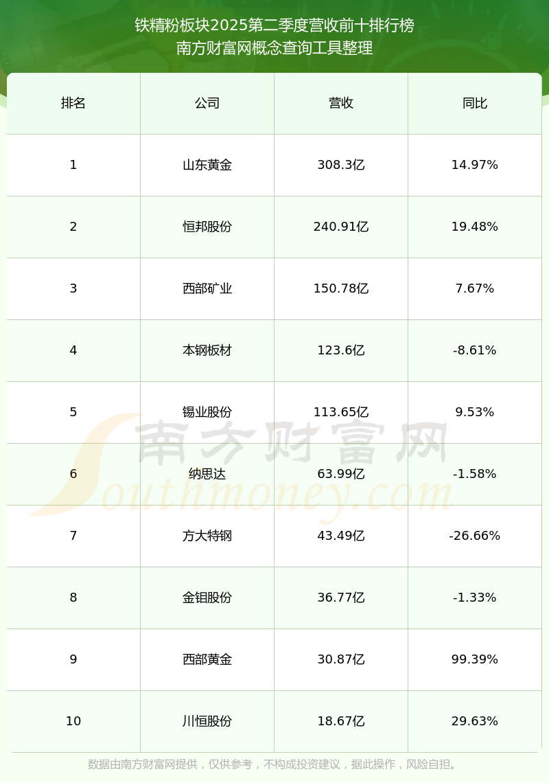 按照南方財富網(wǎng)概念查詢工具統(tǒng)計,該股所屬板塊為鐵精粉板塊,該板塊共有32只股票,寶地礦業(yè)2025第二季度營收在該板塊中排名為第24名,該板塊2025第二季度營收排名前十的股票如下表: