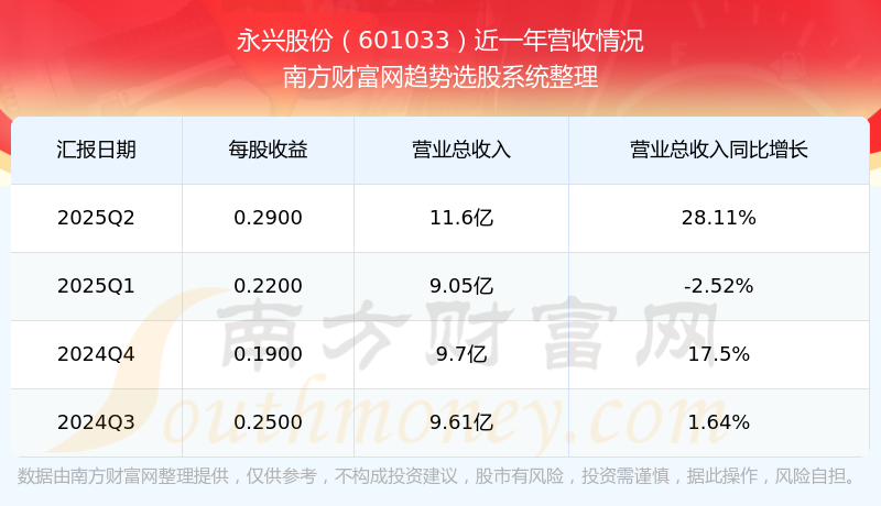 A股上市公司永興股份(代碼:601033)發(fā)布2025年第二季度財報,公司2025年第二季度歸屬于上市公司股東的凈利潤為2.65億元,凈利潤同比增長21.17%,環(huán)比增長34.61%。