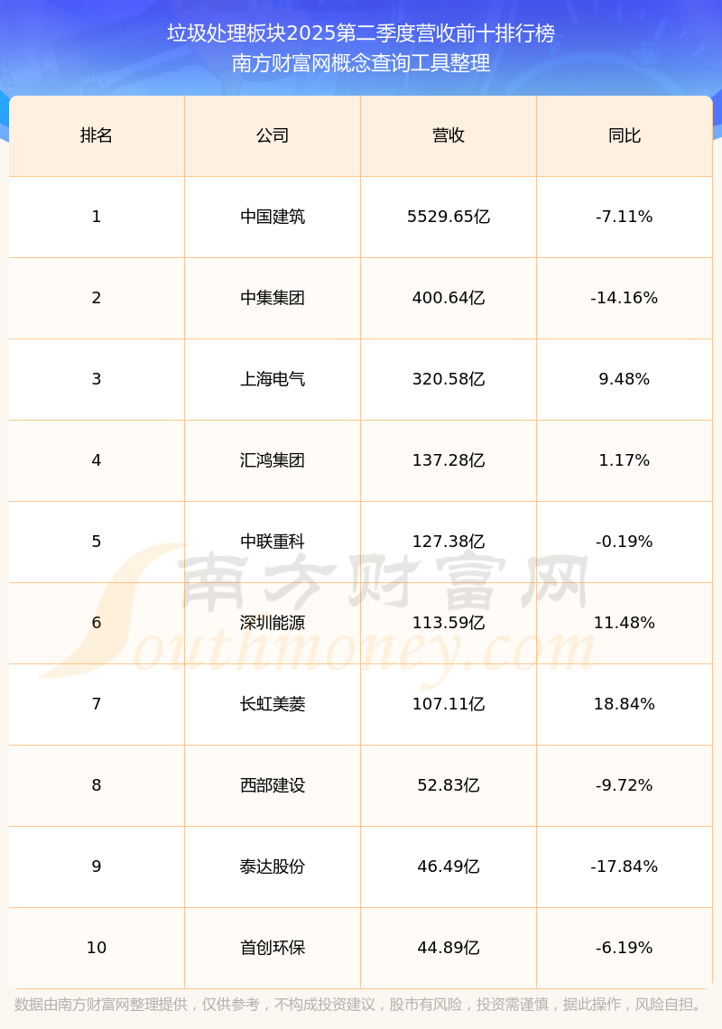 按照南方財富網(wǎng)概念查詢工具統(tǒng)計,該股所屬板塊為垃圾處理板塊,該板塊共有57只股票,永興股份2025第二季度營收在該板塊中排名為第30名,該板塊2025第二季度營收排名前十的股票如下表: