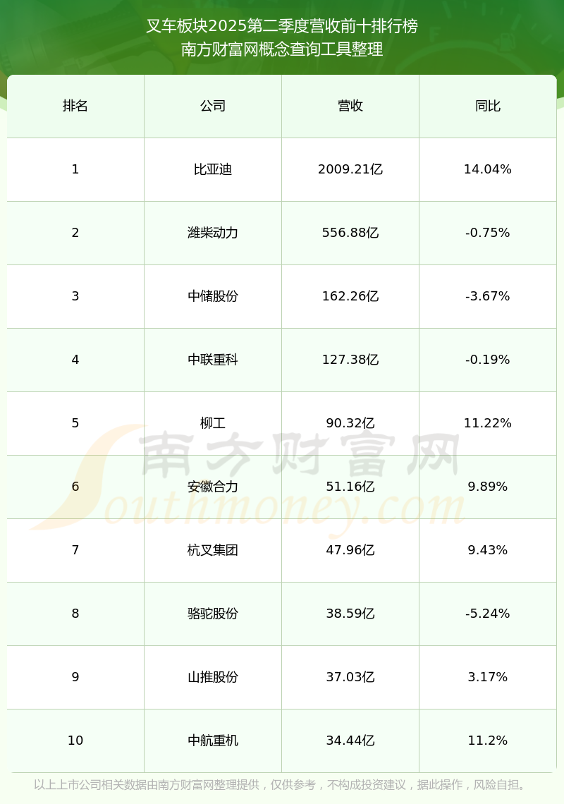 按照南方財富網(wǎng)概念查詢工具統(tǒng)計,該股所屬板塊為叉車板塊,該板塊共有24只股票,安徽合力2025第二季度營收在該板塊中排名為第6名,該板塊2025第二季度營收排名前十的股票如下表: