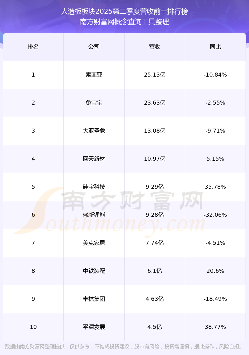 按照南方財(cái)富網(wǎng)概念查詢工具統(tǒng)計(jì),該股所屬板塊為人造板板塊,該板塊共有22只股票,豐林集團(tuán)2025第二季度營收在該板塊中排名為第9名,該板塊2025第二季度營收排名前十的股票如下表: