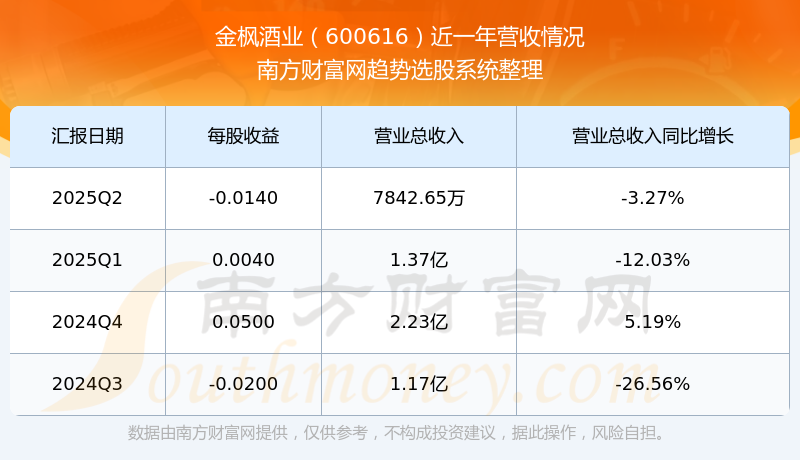 按照南方財富網(wǎng)概念查詢工具統(tǒng)計,該股所屬板塊為釀酒行業(yè)板塊,該板塊共有42只股票,金楓酒業(yè)2025第二季度營收在該板塊中排名為第37名,該板塊2025第二季度營收排名前十的股票如下表: