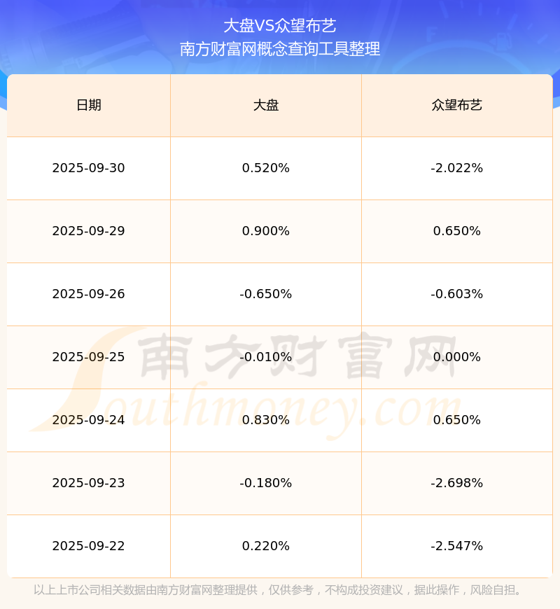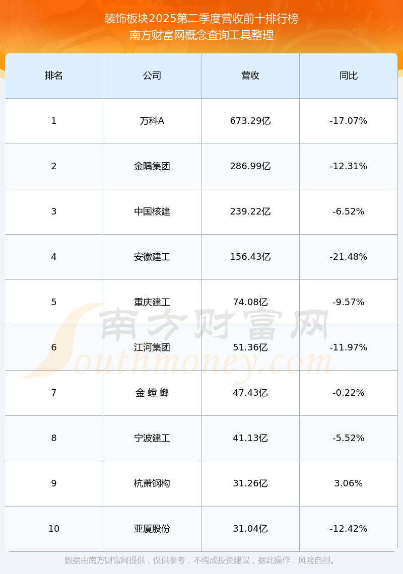 按照南方財(cái)富網(wǎng)概念查詢工具統(tǒng)計(jì),該股所屬板塊為裝飾板塊,該板塊共有55只股票,眾望布藝2025第二季度營收在該板塊中排名為第55名,該板塊2025第二季度營收排名前十的股票如下表: