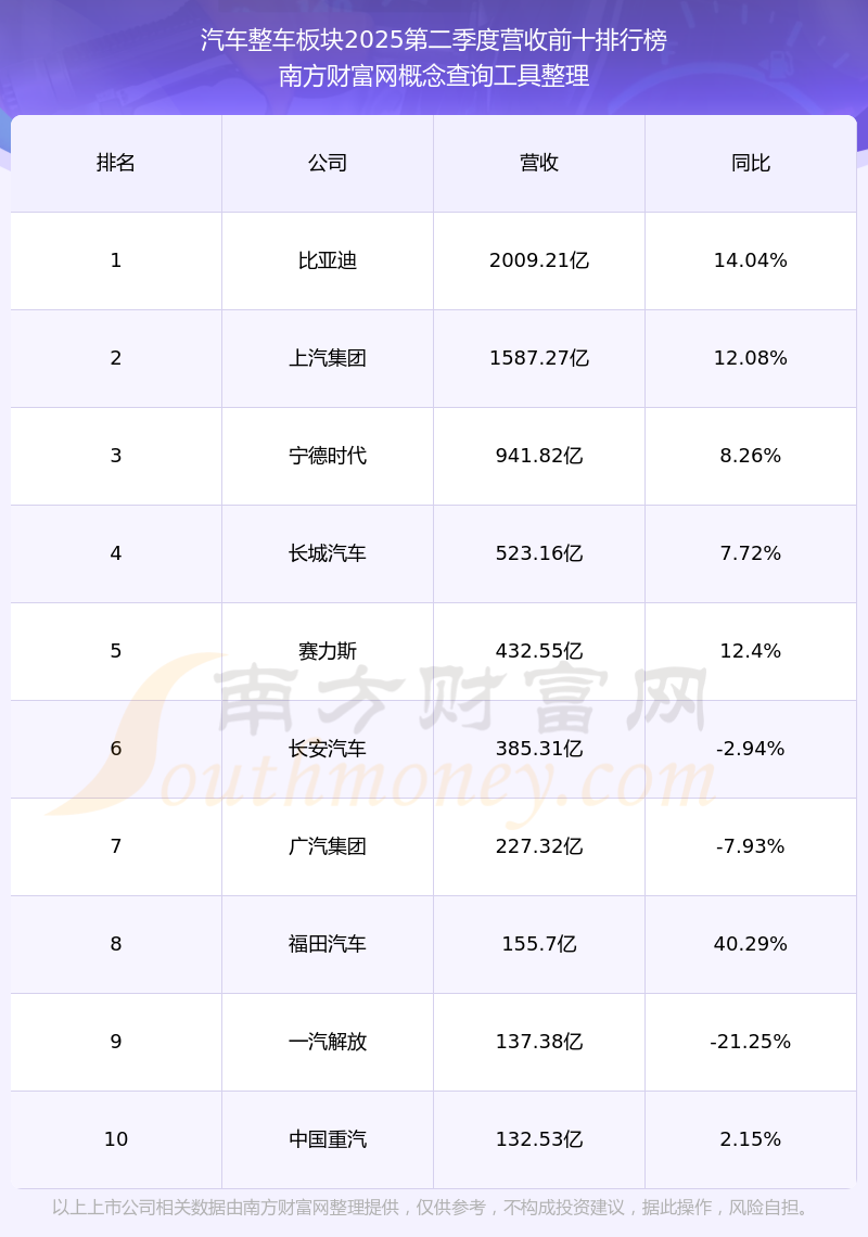 按照南方財(cái)富網(wǎng)概念查詢工具統(tǒng)計(jì),該股所屬板塊為汽車整車板塊,該板塊共有45只股票,千里科技2025第二季度營收在該板塊中排名為第23名,該板塊2025第二季度營收排名前十的股票如下表:
