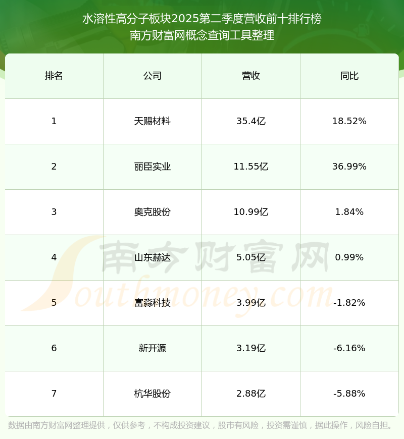 按照南方財(cái)富網(wǎng)概念查詢工具統(tǒng)計(jì),該股所屬板塊為水溶性高分子板塊,該板塊共有7只股票,富淼科技2025第二季度營收在該板塊中排名為第5名,該板塊2025第二季度營收排名前十的股票如下表: