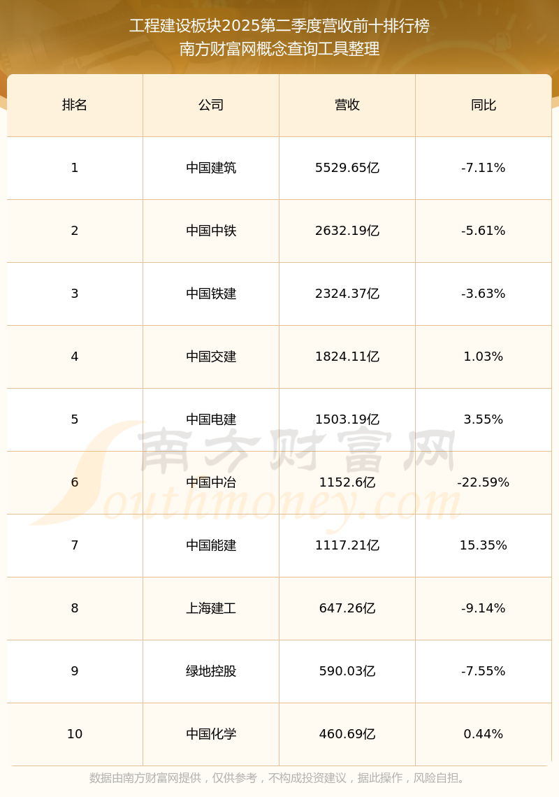 按照南方財(cái)富網(wǎng)概念查詢工具統(tǒng)計(jì),該股所屬板塊為工程建設(shè)板塊,該板塊共有142只股票,祥龍電業(yè)2025第二季度營(yíng)收在該板塊中排名為第140名,該板塊2025第二季度營(yíng)收排名前十的股票如下表: