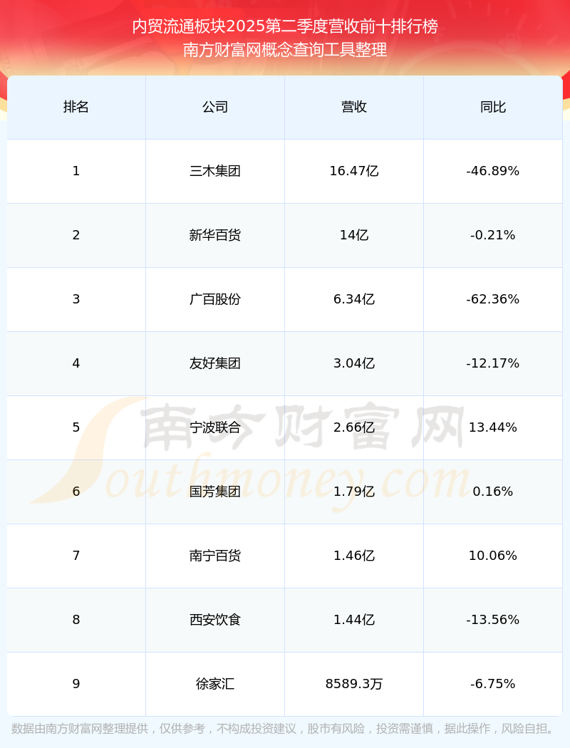 按照南方財富網(wǎng)概念查詢工具統(tǒng)計,該股所屬板塊為內(nèi)貿(mào)流通板塊,該板塊共有9只股票,茂業(yè)商業(yè)2025第二季度營收在該板塊中排名為第9名,該板塊2025第二季度營收排名前十的股票如下表: