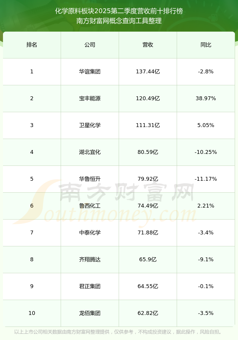 按照南方財富網(wǎng)概念查詢工具統(tǒng)計(jì),該股所屬板塊為化學(xué)原料板塊,該板塊共有110只股票,中鹽化工2025第二季度營收在該板塊中排名為第14名,該板塊2025第二季度營收排名前十的股票如下表: