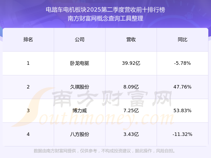 按照南方財(cái)富網(wǎng)概念查詢工具統(tǒng)計(jì),該股所屬板塊為電踏車電機(jī)板塊,該板塊共有4只股票,八方股份2025第二季度營收在該板塊中排名為第4名,該板塊2025第二季度營收排名前十的股票如下表: