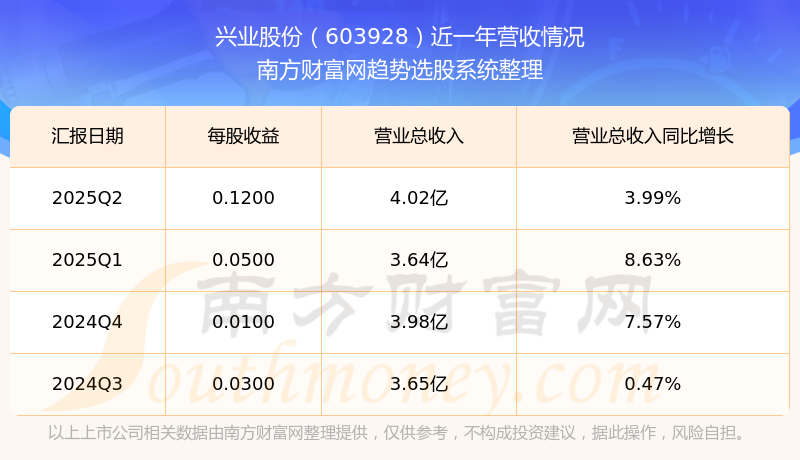 在2025年第二季度,興業(yè)股份的業(yè)績表現(xiàn),主營業(yè)務(wù)收入達(dá)到4.02億元,實(shí)現(xiàn)了3.99%的同比增長率。同時,公司歸母凈利潤錄得3213.45萬元,同比增長160.44%。