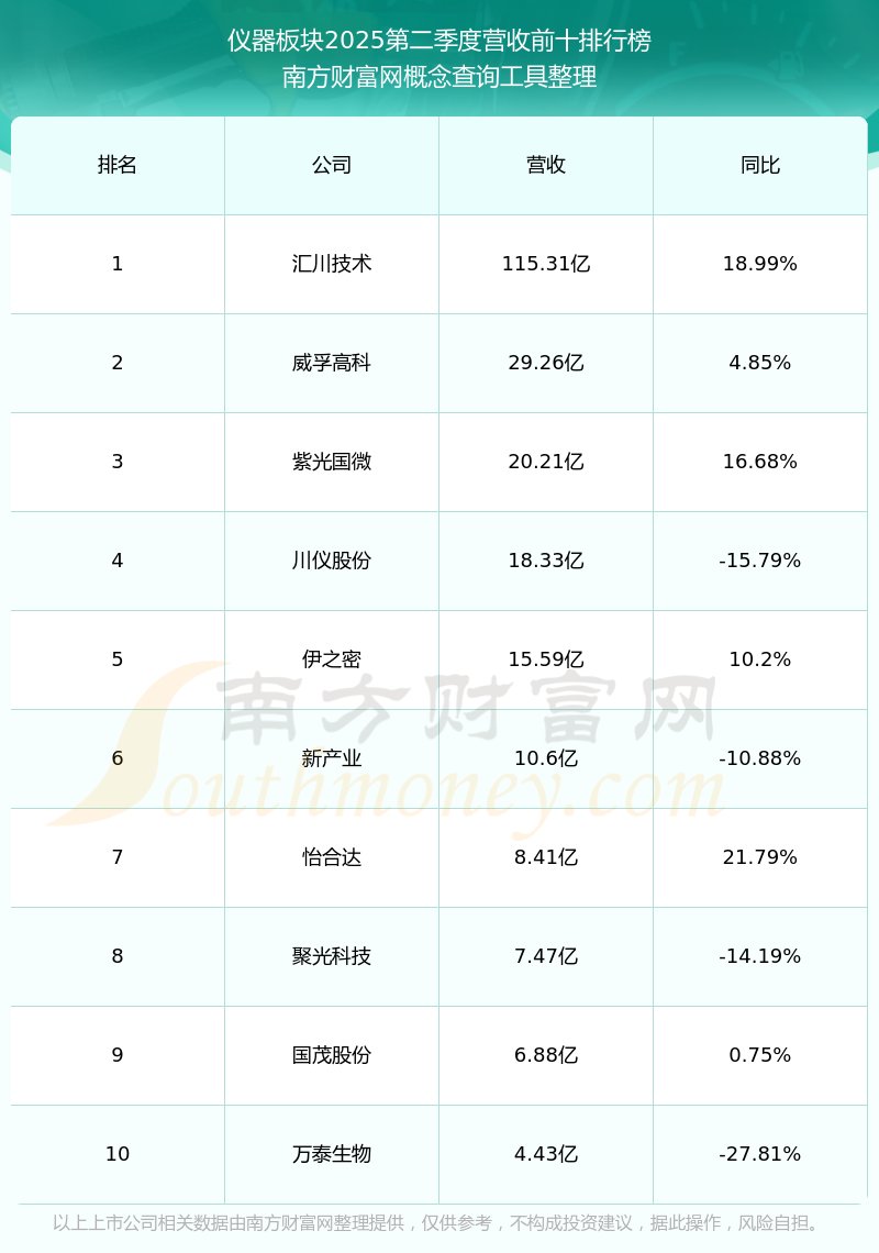 按照南方財富網(wǎng)概念查詢工具統(tǒng)計,該股所屬板塊為儀器板塊,該板塊共有24只股票,坤恒順維2025第二季度營收在該板塊中排名為第24名,該板塊2025第二季度營收排名前十的股票如下表: