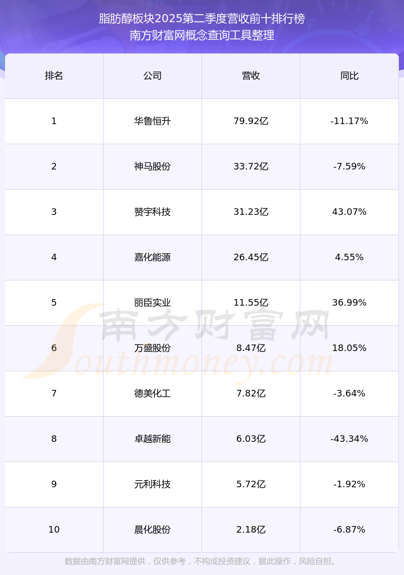 按照南方財(cái)富網(wǎng)概念查詢工具統(tǒng)計(jì),該股所屬板塊為脂肪醇板塊,該板塊共有11只股票,元利科技2025第二季度營收在該板塊中排名為第9名,該板塊2025第二季度營收排名前十的股票如下表: