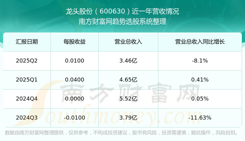 按照南方財(cái)富網(wǎng)概念查詢工具統(tǒng)計(jì),該股所屬板塊為紡織服裝板塊,該板塊共有156只股票,龍頭股份2025第二季度營(yíng)收在該板塊中排名為第90名,該板塊2025第二季度營(yíng)收排名前十的股票如下表: