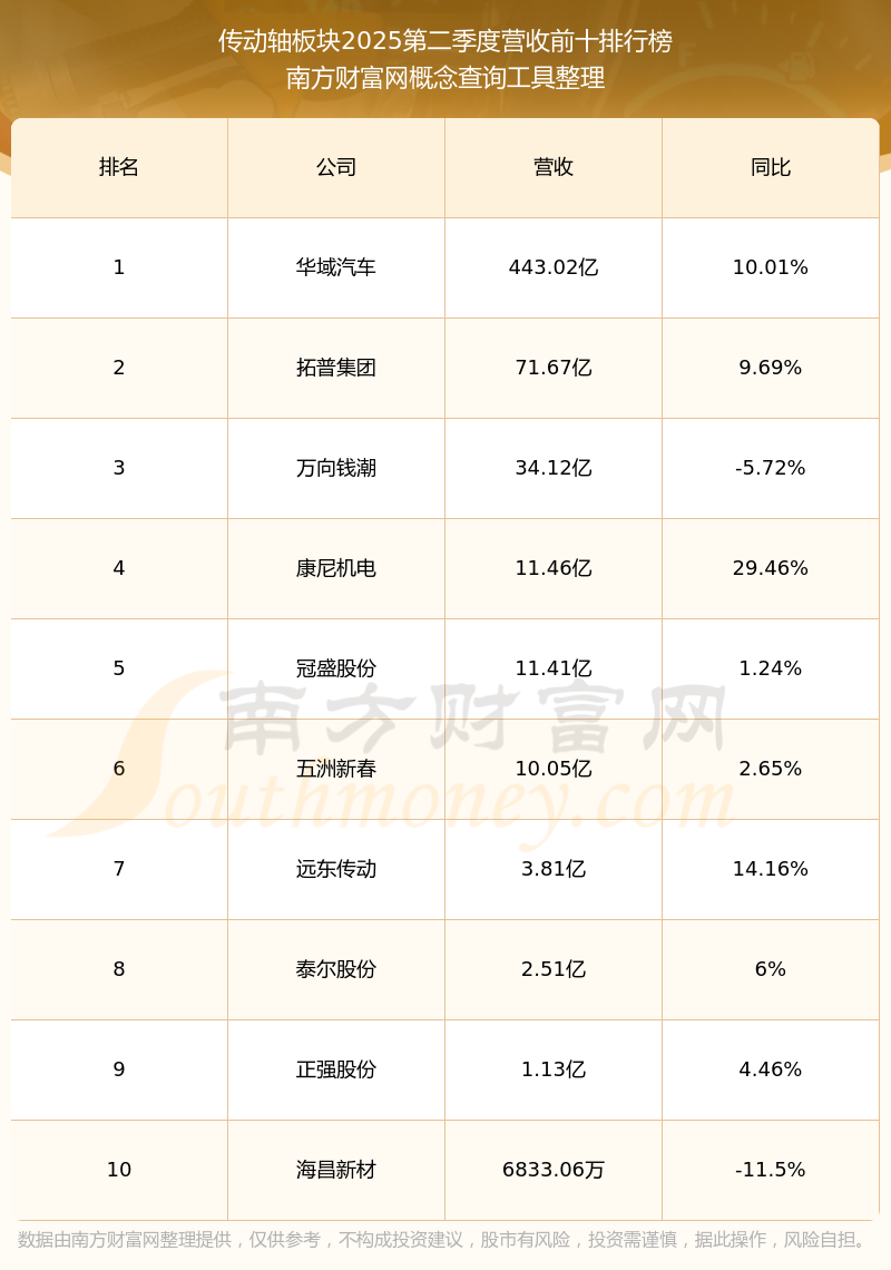 按照南方財富網(wǎng)概念查詢工具統(tǒng)計,該股所屬板塊為傳動軸板塊,該板塊共有11只股票,冠盛股份2025第二季度營收在該板塊中排名為第5名,該板塊2025第二季度營收排名前十的股票如下表: