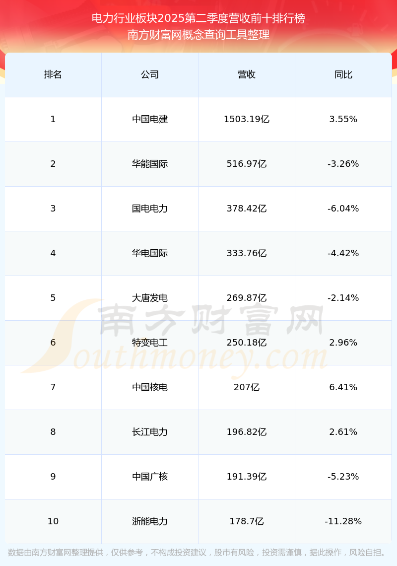 按照南方財(cái)富網(wǎng)概念查詢工具統(tǒng)計(jì),該股所屬板塊為電力行業(yè)板塊,該板塊共有93只股票,聯(lián)美控股2025第二季度營收在該板塊中排名為第80名,該板塊2025第二季度營收排名前十的股票如下表: