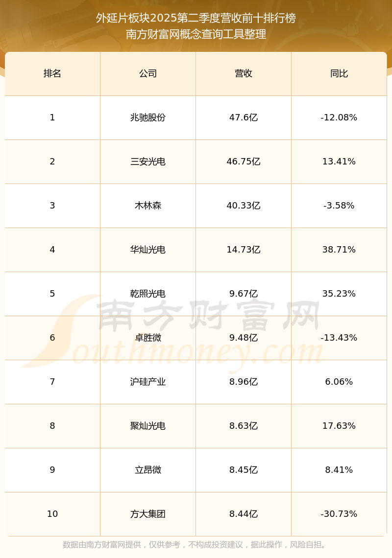 按照南方財(cái)富網(wǎng)概念查詢工具統(tǒng)計(jì),該股所屬板塊為外延片板塊,該板塊共有14只股票,上海合晶2025第二季度營(yíng)收在該板塊中排名為第14名,該板塊2025第二季度營(yíng)收排名前十的股票如下表: