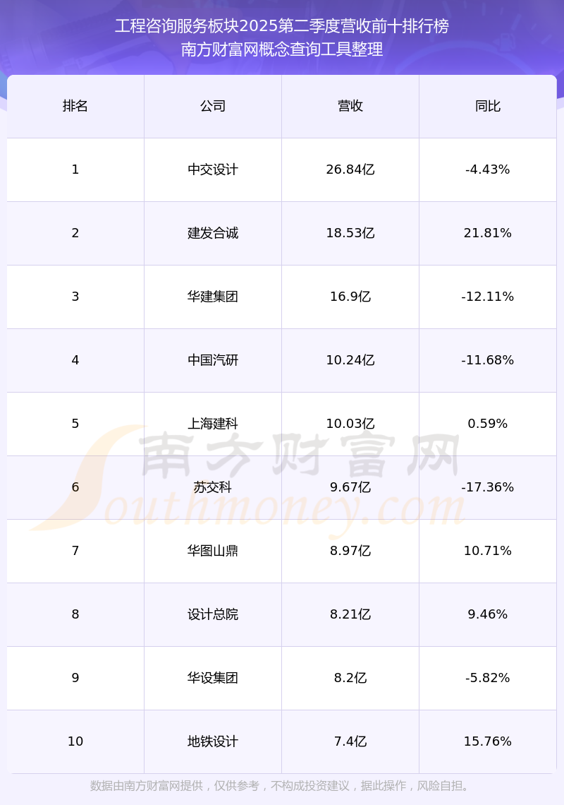 按照南方財(cái)富網(wǎng)概念查詢工具統(tǒng)計(jì),該股所屬板塊為工程咨詢服務(wù)板塊,該板塊共有43只股票,設(shè)計(jì)總院2025第二季度營(yíng)收在該板塊中排名為第8名,該板塊2025第二季度營(yíng)收排名前十的股票如下表: