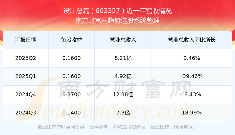 設(shè)計(jì)總院2025年第二季度財(cái)報(bào)顯示,公司主營(yíng)收入8.21億元,同比9.46%;歸母凈利潤(rùn)9163.98萬(wàn)元,同比-24.66%;扣非凈利潤(rùn)7998.87萬(wàn)元,同比-42.85%。