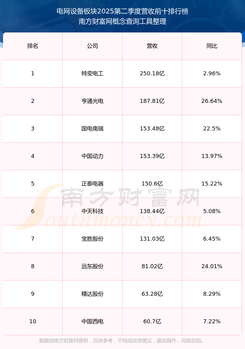 按照南方財富網概念查詢工具統(tǒng)計,該股所屬板塊為電網設備板塊,該板塊共有169只股票,海興電力2025第二季度營收在該板塊中排名為第59名,該板塊2025第二季度營收排名前十的股票如下表: