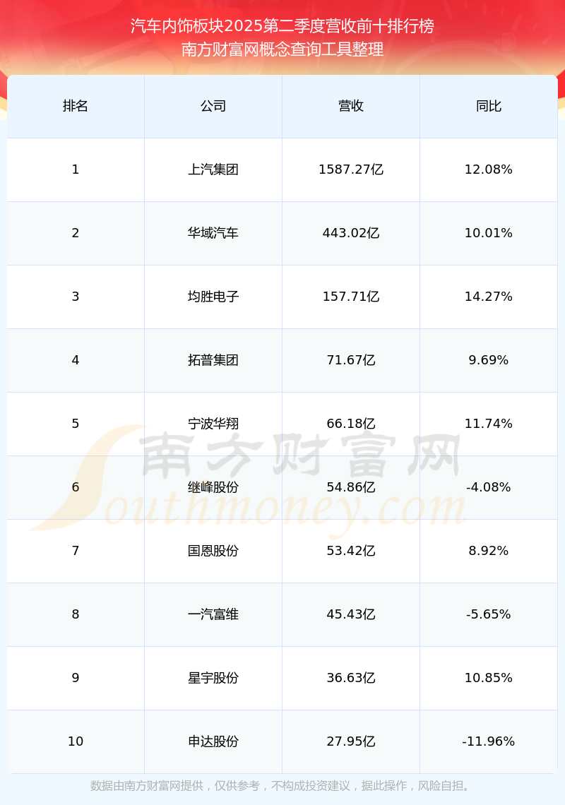 按照南方財(cái)富網(wǎng)概念查詢工具統(tǒng)計(jì),該股所屬板塊為汽車內(nèi)飾板塊,該板塊共有32只股票,一汽富維2025第二季度營收在該板塊中排名為第8名,該板塊2025第二季度營收排名前十的股票如下表: