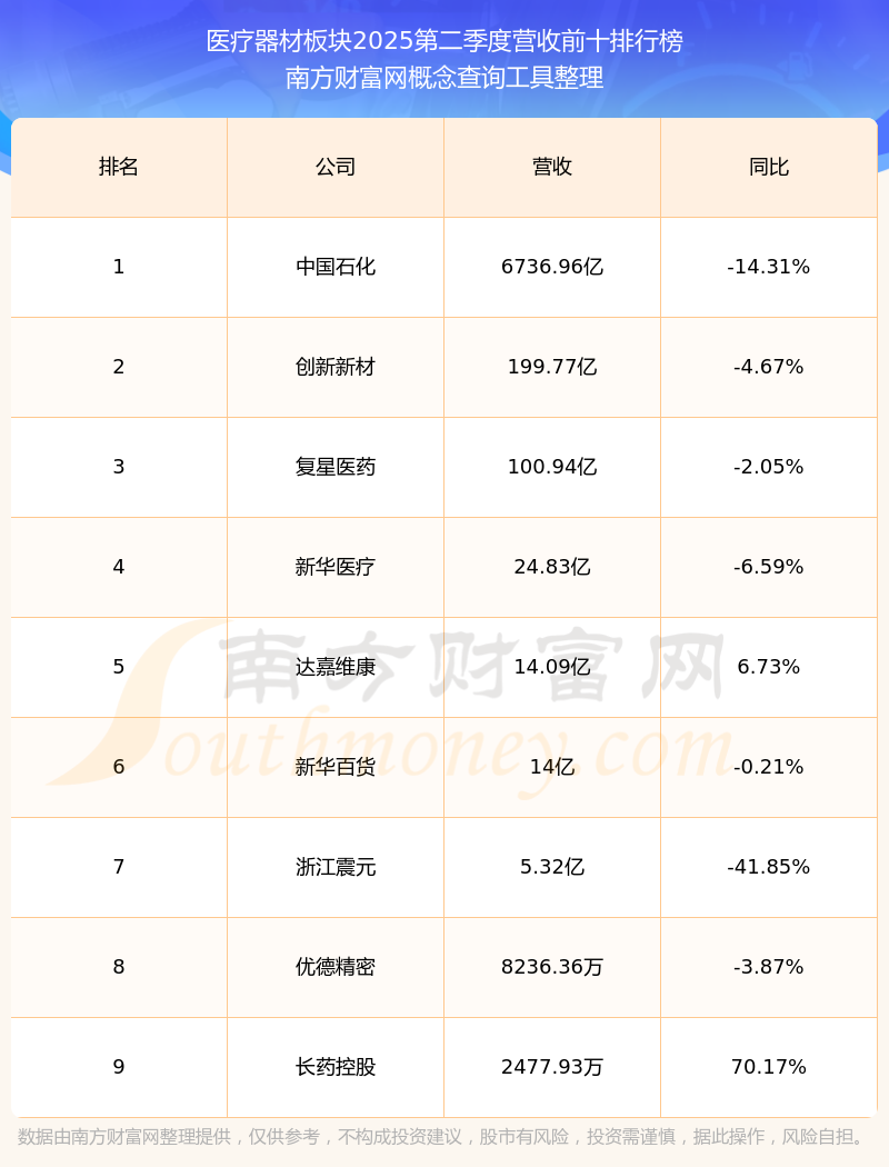按照南方財富網(wǎng)概念查詢工具統(tǒng)計,該股所屬板塊為醫(yī)療器材板塊,該板塊共有9只股票,心脈醫(yī)療2025第二季度營收在該板塊中排名為第9名,該板塊2025第二季度營收排名前十的股票如下表:
