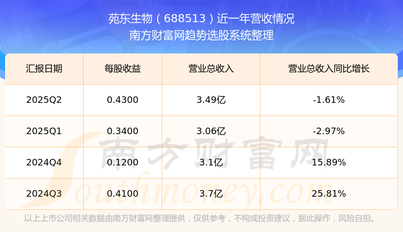 苑東生物(688513)披露2025年第二季度報告,報告期實現(xiàn)營收3.49億元,同比-1.61%;歸母凈利潤7598.16萬元,同比6.29%;扣非凈利潤5734.13萬元,同比-6.89%;基本每股收益0.43元。